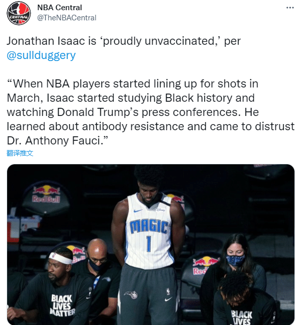魔术新星艾萨克更疯狂,为不接种疫苗而感到自豪,他在今年三月份开始了解抗体抵抗,开始不信任福奇博士,开始关注那些死于疫苗的人,因此艾萨克宁愿相信上帝,也不再完全相信人,并且认为未接种疫苗的球员会受到诽谤和欺凌。