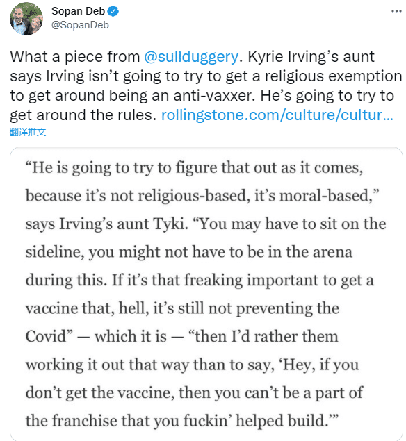 欧文的姑姑表示:不止是欧文,联盟还有其他很多球员都还没有选择接种。我认为联盟应该出台对应的措施。比如(没有接种的球员)每三场比赛(做一次检测)。这样依然可以保证整个赛季大家彼此的交流互动以及对场上球员的管理。但就目前的规定来看,它带有很大的强迫性。联盟和球员之间应该可以通过某种方式去达成一个协议