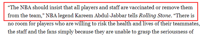 对于球员拒绝接种疫苗这件事,NBA传奇人物贾巴尔表示:联盟应该要求所有球员和工作人员都接种疫苗或者将他们从球队中除名;联盟正在催促球员接种疫苗,目前大概还有50-60名球员未接种疫苗,随着新赛季训练营即将开启,关于球员是否接种疫苗的话题引发关注,而球员工会副主席欧文的决定将对联盟产生很大的影响。