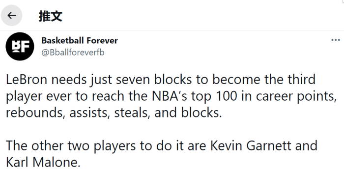 来源:24直播网09-24 11:2924直播网讯9月24日讯 ,据美媒Basketball Forever报道,湖人球星勒布朗詹姆斯只差7次封盖,就可以成为NBA常规赛历史第三位在得分、篮板、助攻、抢断以及盖帽这5项主要数据全部位列历史前100的球员。目前历史上只有两名巨星做到这一点,分别是卡尔马龙和加内特。