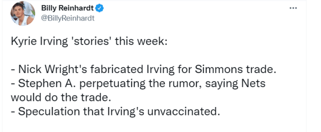 新赛季还没正式开始,欧文已经成为舆论的焦点。篮网记者雷哈特指出,过去这一周,先是名嘴尼克-奈特透露欧文如果被交易就会退役,然后是斯蒂芬-A-史密斯认为篮网要不是因为杜兰特,就会把欧文拿去换西蒙斯,接下来,又是欧文仍未接种疫苗可能缺赛的报道。