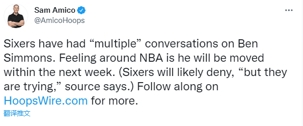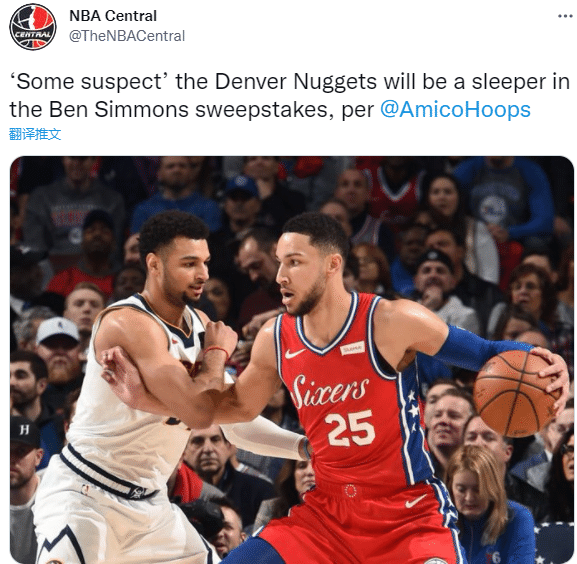 该记者还报道,目前掘金也是本-西蒙斯的潜在下家之一;这笔交易极有可能是一笔多方大交易,76人已经就西蒙斯的交易与联盟其他球队有过多次对话,联盟内部普遍认为西蒙斯会在一周之内被交易。