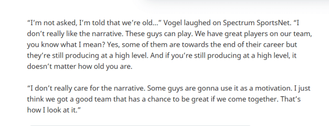 主持人询问沃格尔,是不是经常被问到球队的年龄问题,沃格尔的回应挺搞笑。“我不是被问到,而是直接被告知我们队很老……”沃格尔笑着说,“我不喜欢这样的描述,这些球员能打球,我们队有很好的球员,你们知道我的意思吗?是的,他们中的一些人已经接近职业生涯终点,但他们仍然能有高水平的贡献。如果你能继续保持高水准,年龄多大根本没关系。”
