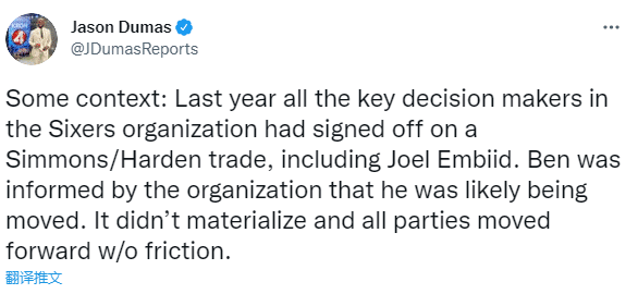 据费城记者JasonDumas的报道,已经有几个76人球迷组织计划在训练营开始后去现场嘘西蒙斯,而西蒙斯非常清楚这一点,这是他拒绝报到的原因之一;该记者还表示,上赛季几乎所有的关键决策者都已经同意了西蒙斯-哈登的交易,其中包括恩比德。西蒙斯当时已经被通知了自己“很有可能”被交易。