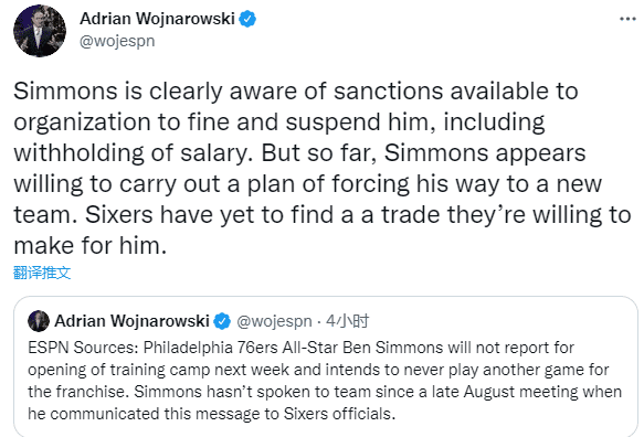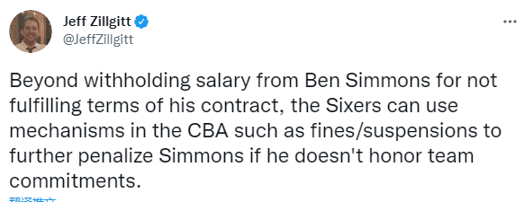 西蒙斯的态度已经很明显,他已经不再搭理76人,对此NBA记者JeffZillgitt分析76人能对西蒙斯进行的惩罚:除了因本-西蒙斯没有按照合约履行自己的职责将被扣除薪水之外,76人仍可以用到CBA机制中的条款对于西蒙斯处以禁赛或者罚款来惩罚他。同时,西蒙斯不可以加入欧洲、澳大利亚或者其他FIBA所承认的联赛,因为FIBA不允许与NBA仍有合同的球员打其他联赛。