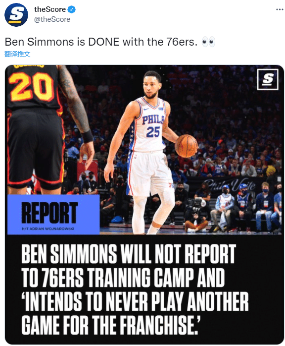对于西蒙斯的坚定态度,美媒TheScore转发名记的报道,并且配文写道:西蒙斯的76人生涯已经结束了。 名记Marc Stein跟进报道,内部人士透露,现在根本看不到西蒙斯重返费城的情况。