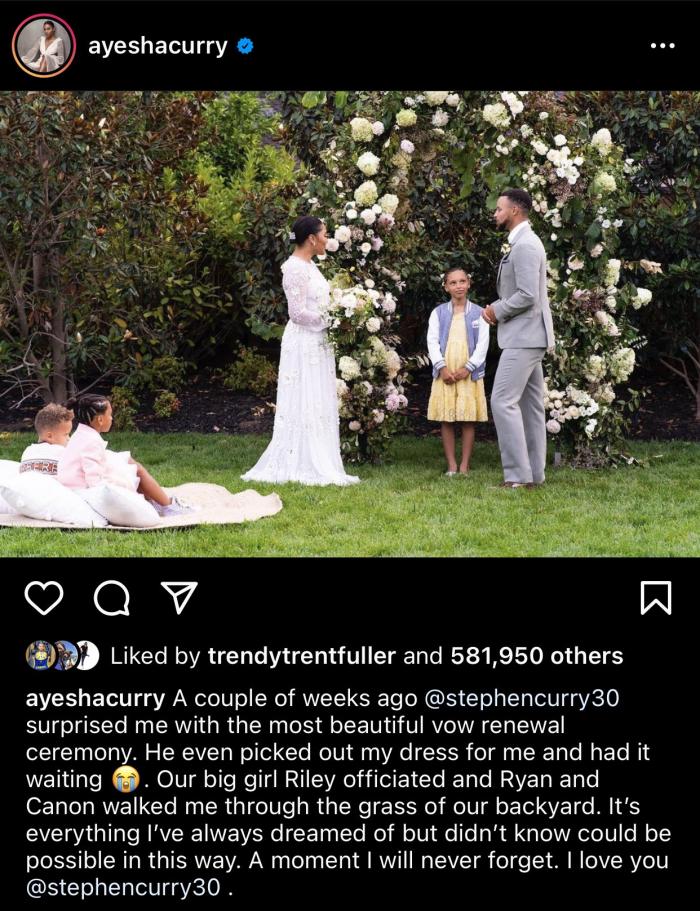 阿耶莎晒出现场的幸福照,配文:几周前,库里举行了最漂亮的宣誓仪式,这让我大吃一惊。他为我挑选了衣服并且让我等着;我们的大女儿莱利主持了仪式,瑞安和卡侬陪我穿过后院的草地。这是我的梦想,但我不知道这一切可以通过这种方式实现。一个我永远不会忘记的时刻。我爱你库里。
