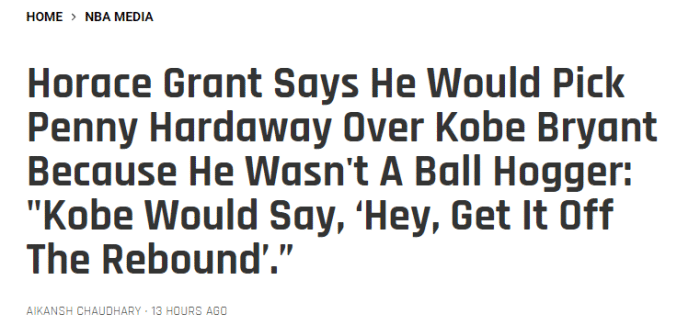 格兰特这样形容便士哈达威和科比的赛场风格,首先格兰特也表示科比对自己也很好,之后格兰特就讲解道:我和便士哈达威说“我想要投篮”,便士哈达威会这样回应:“好的,我会让你拿到球。”,但科比会说“嘿,你去抢好篮板球。”,
