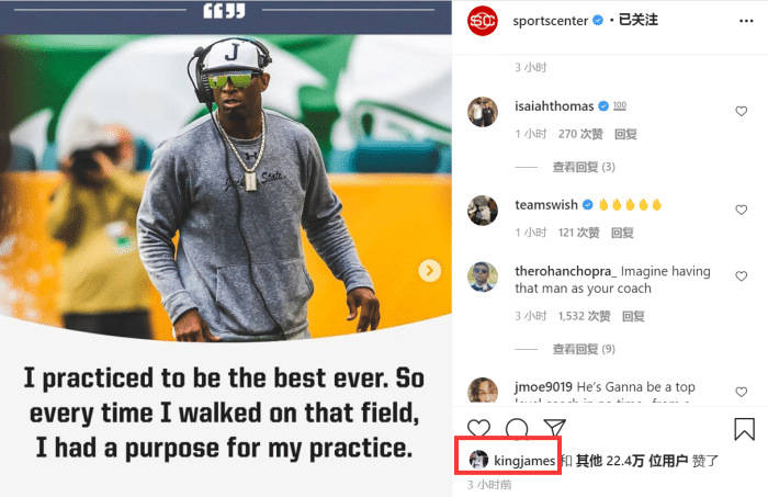 来源:24直播网09-21 16:1024直播网讯9月21日讯 ,湖人巨星詹姆斯前不久更新社交平台,点赞并转发了NFL名人堂球员迪昂桑德斯的采访言论:我训练是为了成为历史最佳球员,所以每当我走上那块球场,我都是带有目的去完成训练。