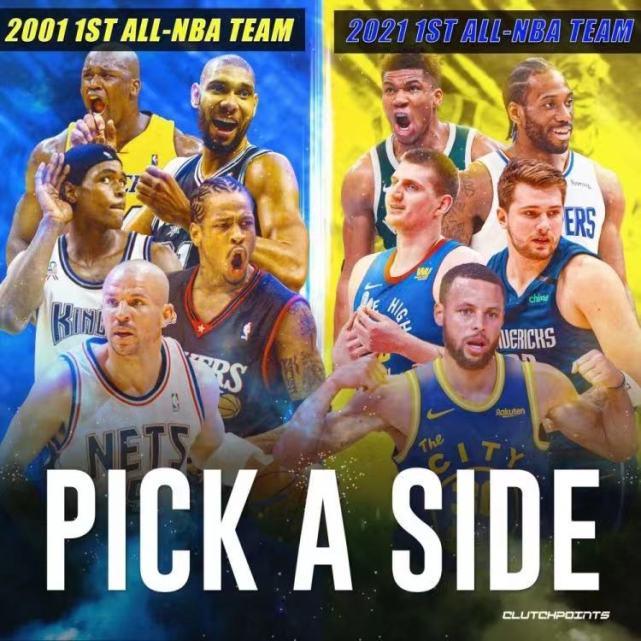 2001年一阵是:基德、艾弗森、韦伯、邓肯和奥尼。2021年一阵是:库里、东契奇、小卡、字母哥和约基奇。