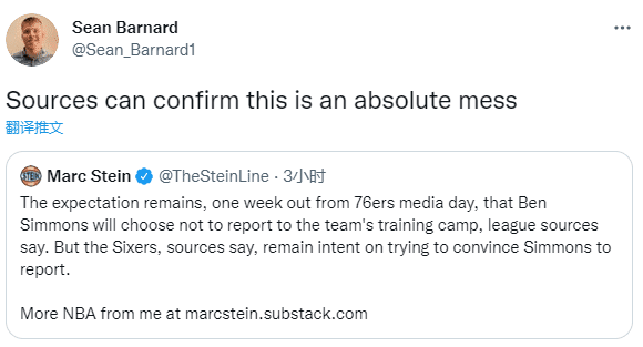 来源:24直播网09-21 09:5024直播网讯9月21日讯 ,76人和西蒙斯的最新情况曝光,据名记Marc Stein报道,西蒙斯仍旧坚持不去球队报到,不过76人依旧打算说服西蒙斯来球队报到;对此另一记者SeanBarnard表示:消息来源可以确认,现在的情况是一团糟。