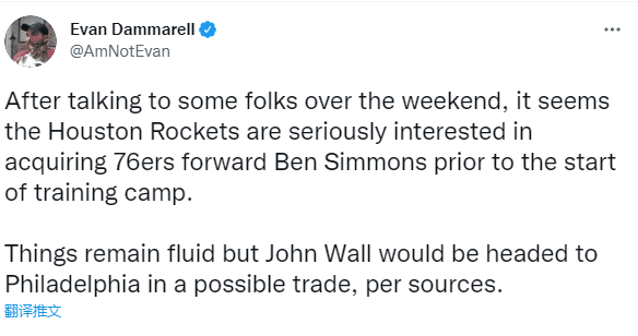 既然西蒙斯去意已决,76人只能继续尝试交易他,据克利夫兰记者EvanDammarell报道,从上周末开始,火箭似乎对在新赛季训练营开始之前交易得到76人球员本-西蒙斯有了兴趣。现在的情况仍然极不稳定,但约翰-沃尔可能会在这笔交易中被送到76人。