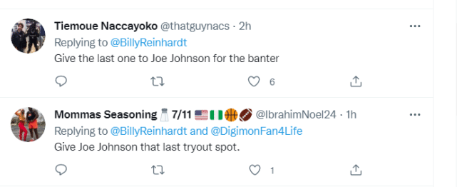 篮网跟队记者Billy Reinhardt随后晒出了训练营的19人名单:杜兰特、哈登、欧文、哈里斯、格里芬、阿尔德里奇、米尔萨普、米尔斯、克拉克斯顿、布朗、詹姆斯-约翰逊、杰文-卡特、托马斯、本布里、敦布亚、夏普、爱德华兹、卡考克和小杜克。他们还可以再签一人,不少球迷建议篮网把名额留给乔-约翰逊,让这位老将试试。 40岁的乔-约翰逊刚刚蝉联了BIG3联赛的MVP。
