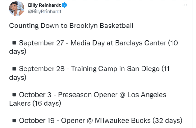 距离新赛季已经越来越近了,Billy Reinhardt迫不及待晒出倒计时:9月28日(北京时间,下同)媒体日(10天后),9月29日在圣迭戈开始训练营(11天后),10月4日季前赛首战湖人(16天后)、10月20日揭幕战对雄鹿(32天后)。大家认为新赛季的篮网会取得怎样的成绩?