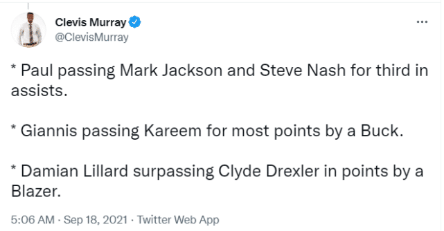 利拉德生涯至今已经为开拓者拿到16815分,位居队史第二。新赛季,他有望超过德雷克斯勒,成为开拓者队史得分王。德雷克斯勒效力开拓者时期拿到18040分,利拉德还要再拿1226分,就能超过滑翔机。生涯至今,利拉德每个赛季的得分都能超过这个数。