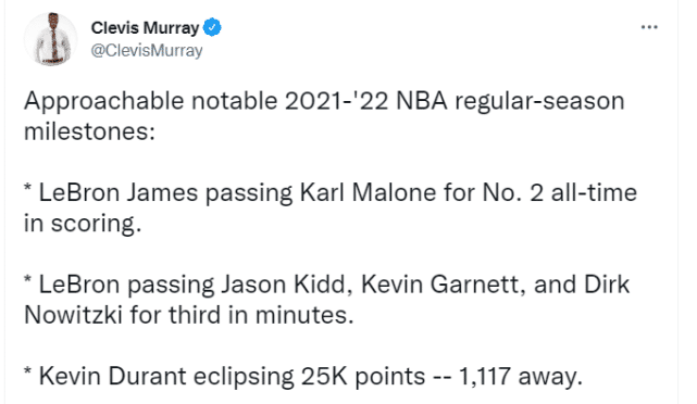 来源:24直播网09-18 10:1524直播网讯9月18日讯 ,NBA记者Clevis Murray列出了2021-22赛季的10大重要里程碑,詹姆斯独占其中3席,杜兰特、库里等多位球星也将迎来个人生涯的重要时刻——
