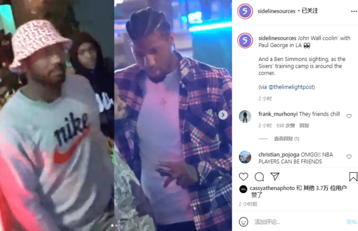 相聚会面之后,沃尔身穿白色卫衣和灰色牛仔裤,戴着帽子上车,期间有球迷问沃尔喜欢LA吗?想要来快船队吗?对此沃尔只是微微一笑;乔治身穿格子衫,站在路边与友人说话,西蒙斯也在这个地方,他身穿黑色T恤、戴着棒球帽,现场聚集了很多粉丝。