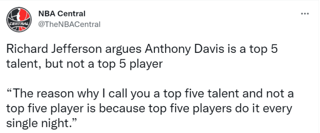 来源:24直播网09-16 11:0724直播网讯9月16日讯 ,詹姆斯前队友理查德-杰弗森在一档节目中谈到了浓眉。他认为浓眉有联盟前五的天赋,却不是联盟前五的球员。杰弗森的言论,很快引起球迷的热议。