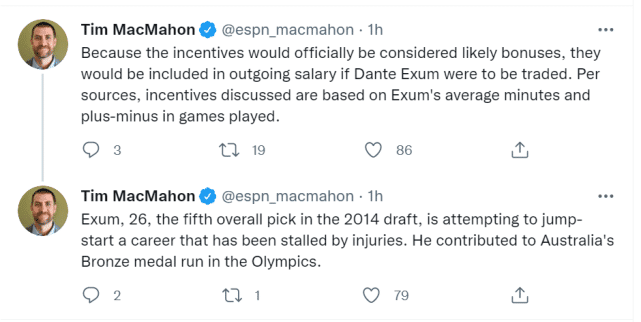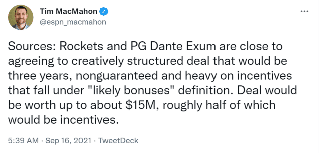 来源:24直播网09-16 11:0524直播网讯9月16日讯 ,据名记Tim MacMahon报道,消息人士透露,火箭与埃克萨姆接近达成一份3年1500万美元的无保障合同。这份合同很特别,三年无保障,总金额近一半为非常可能得到的奖金,因此,当埃克萨姆被交易时,奖金可以被计入工资。这些奖金将主要基于他的平均上场时间及比赛正负值。