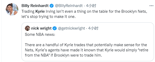 美媒ROSS也回应欧文交易流言,发推:篮网没有交易凯里-欧文,内部根本没有讨论过,也永远不会讨论的。