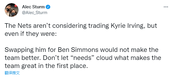 篮网有必要交易欧文拆散三巨头吗?答案是否定的,篮网队记Billy Reinhardt发推回应:交易欧文对布鲁克林篮网来说甚至都不是一件可以考虑的事情,让我们停止造谣吧;另一记者Alec Sturm发推:篮网没有考虑交易欧文,但即使他们考虑过:把他换成本·西蒙斯不会让球队变得更好。不要让“需要”蒙蔽了团队最初的目标。