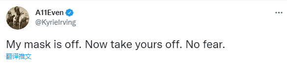 不久前,欧文发推写道:我的面罩已经摘掉,现在摘掉你们的吧,不用害怕。
