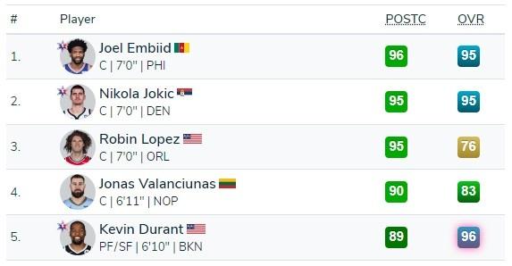 恩比德96,约基奇和小洛并列第2,均为95,瓦兰90排名第4。其实小球时代,已经很少以中锋背打为主要战术了,恩比德和约基奇是比较擅长这项技能的,背身技术有稳定度,对手很难防。现在的中锋基本上是面框投篮,或者是挡拆顺下攻框,时代不同了,打法也不同了!