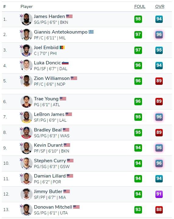 哈登98,字母哥和恩比德97,锡安、东契奇、特雷杨96,这是联盟的几大造犯规高手!哈登的造犯规一直是联盟顶尖,球商高,善于观察,善于利用联盟的规则,联盟为了防范他的三分造犯规和突破造犯规调整了吹罚尺度。恩比德和字母哥则是因为体型的原因,在内线杀伤力太大,很多时候都是故意被对手犯规。东契奇和特雷杨则是新生代中,很擅长“碰瓷”造犯规的人物。