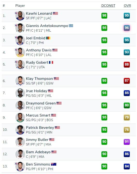 小卡98,字母哥、恩比德、浓眉、戈贝尔、克莱、霍勒迪、追梦、斯玛特和贝弗利,他们均为95并列第二!应该说这是整体差异最小的一块,小卡的防守成名已久,早年间在总决赛中对詹姆斯死亡缠绕被广大球迷认可,拥有着非常大的手掌和不错的臂展,防守意识和技巧顶尖。