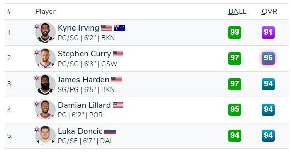 欧文99,哈登库里97,利拉德95!2K从没有出现任何一项能力值100的情况,99就是历史最高级别了,足以说明他们对欧文的肯定。欧文的控运能力可能是历史最强的那一档,现役无敌手,多次得到艾弗森的称赞。而哈登库里也没差太多,他们的运球也都很有自己的特点,库里的比较灵动,哈登的比较具有迷惑性,因为经常在运球过程中主动制造对手犯规!
