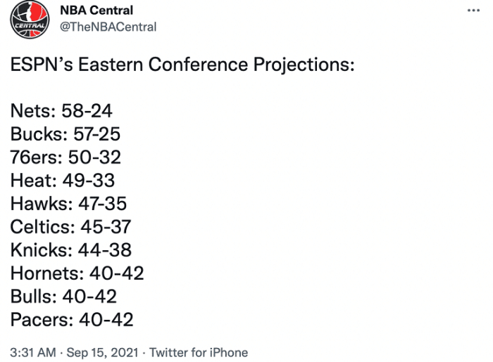 来源:24直播网09-15 11:1124直播网讯9月15日讯 近日外媒《ESPN》对于新赛季的NBA进行展望,预测东部战绩,其中篮网排名第一,雄鹿力压费城,热火重返前四名,老鹰、凯尔特人和尼克斯这三支上赛季参加季后赛的球队位居身后。黄蜂、公牛和步行者这三支球队将会争夺东部第八名。