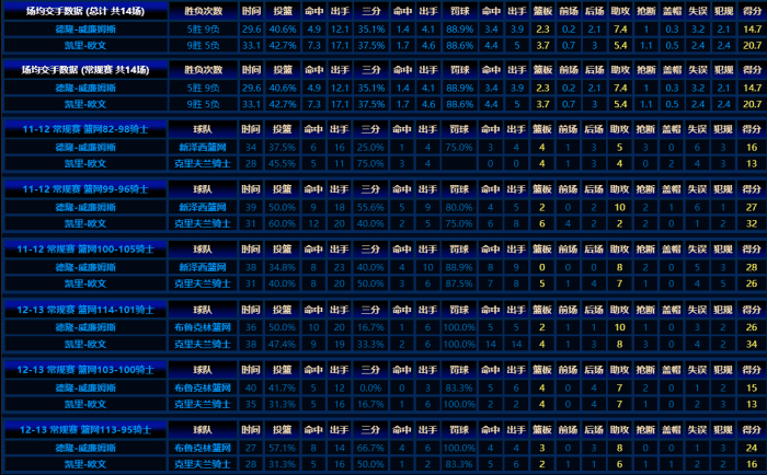 德隆生涯和欧文一共交手14次,在德鲁大叔刚进联盟的前两年,他与德隆的每次对决,两人表现可以说是不相上下。不过后面因为伤病原因,德隆的状态下滑迅速。在这14次相遇中,威廉姆斯场均可以送出14.7分7.4助攻,欧文则是20.7分5.4助攻。