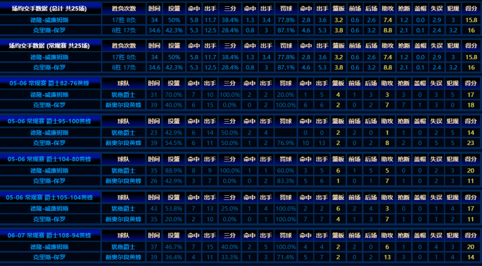 德隆最巅峰时期被认为是联盟仅次于保罗的控卫,实际上每次德隆和保罗交手时,前者总是能打出更好的表现。可以看到,德隆与保罗生涯一共交手25次,威廉姆斯的球队取得17胜8负优势明显,虽然场均15.8分7.4助攻略低于保罗的场均16分8.8助攻,但德隆命中率高达50%,三分命中率也有38.4%。而保罗投篮只有42.3%,三分更是低到28.4%!很多球迷调侃德隆吃饭睡觉打保罗,看来这不是开玩笑,而是事实!