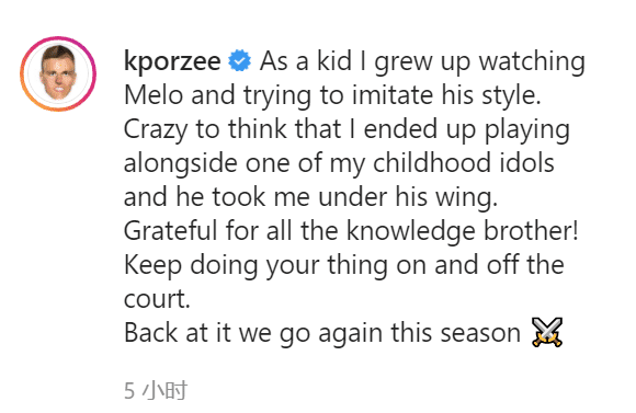 波尔津吉斯在社媒上写道:“当我还是个孩子时,我就会去看安东尼的比赛,并且尝试去模仿他的打法。让我觉得疯狂的是,我竟然能和我儿时的偶像在同一支球队打球,并且在他的羽翼下成长,感谢我的兄弟对我的所有教导。继续坚持你在场上和场下所做的事情吧。我们这个赛季再较量较量。”