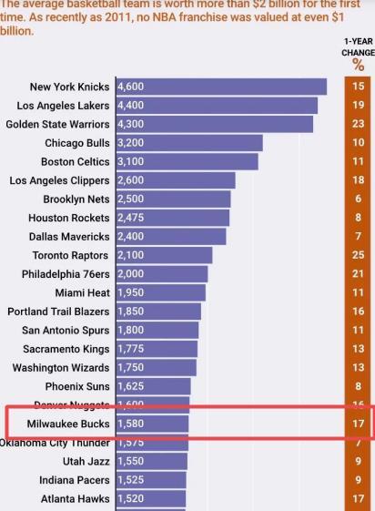 雄鹿队如今为卫斯理带来多少财富呢?7年的打理,卫斯理至少从这支雄鹿队身上得到了上亿的利润,当然相比市值的提升这些都不值一提。2021年,福布斯公布了最新的NBA球队市值排行榜,如今的雄鹿队虽然市值依旧排在NBA第19位,可是它的市值已经达到了15.8亿美元。