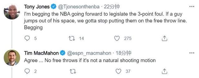 在第一节比赛中,东契奇连续三次尝试跳远投篮,向防守球员争取三分犯规,但是前两次裁判并没有理会,到了第三次东契奇再次施展绝技,这一次裁判响哨音,最终吹罚了三分犯规。而裁判吹罚了这次犯规之后,记者琼斯在推特上抱怨道:我祈求NBA规定三分球犯规,如果球员跳出了他的空间,就不要把他送上罚球线。祈求!而独行侠的跟队记者这一次也是倒戈,独行侠跟队记者麦克马洪赞同琼斯的言论,“同意,如果不是自然投篮动作,就不该给判罚罚球犯规!”