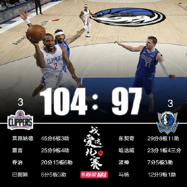 于是快船赢了,104-97击败独行侠,系列赛进入抢七,也是今年季后赛首轮唯一抢七,将在北京时间下周一凌晨3点半开战!