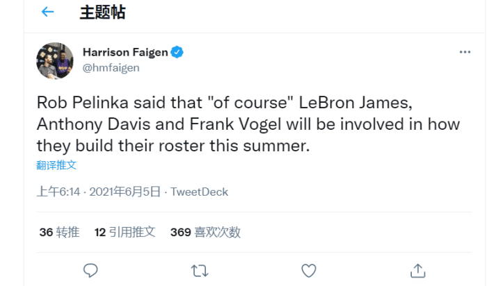 湖人大洗牌?詹眉沃格尔将参与建队!佩林卡:冲击第18冠