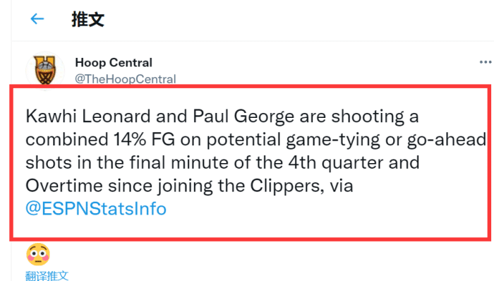 但每每比赛打到关键时刻,两人却又经常掉链子!据美媒hoop central报道,伦纳德和乔治加盟快船以来,两人在第四节或者加时赛最后一分钟,投进即追平或反超比分的出手中,命中率是惨不忍睹的14%!