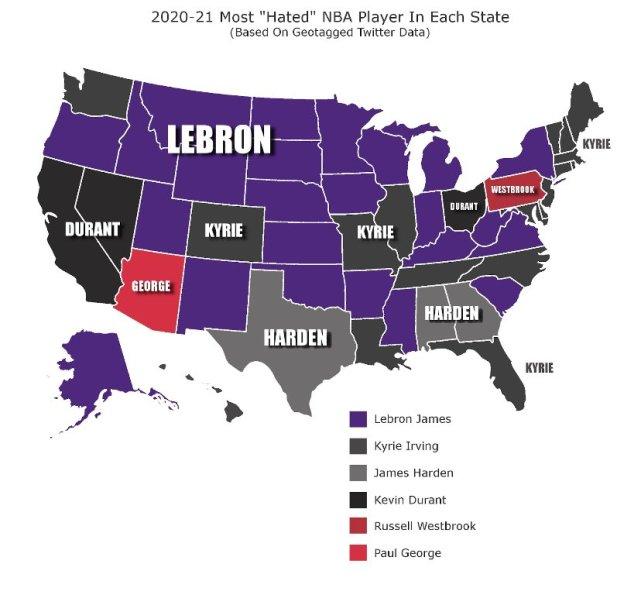 排名第二的是欧文。过去一个赛季,欧文因多次请事假,以及一些场外事件和言论频频引起热议。篮网的另外两位巨头也上榜了,但招黑能力还是比欧文差多了。哈登和杜兰特并列排名第三,各有3个州最不喜欢他们。