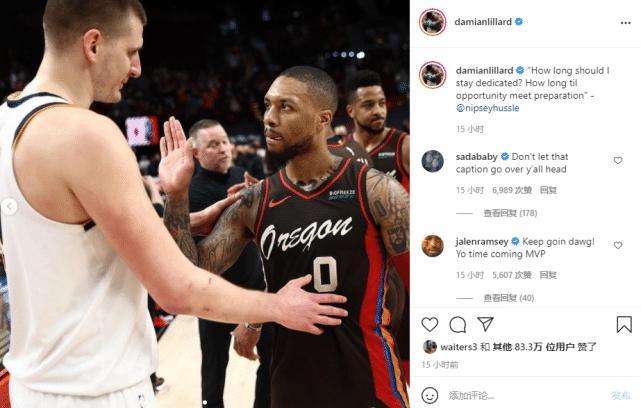 此前被掘金淘汰后,利拉德晒出了自己和约基奇的合影,并以Nipsey Hussle的歌词配文:“我到底还要奉献多久 ?机会何时才会到来?”利拉德的这番言论,在社媒上引起热议。看上去,利拉德的耐心已经快要被耗尽了。