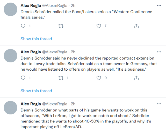 谈到自己在湖人的未来,施罗德说:“在湖人的时光是一段很棒的经历,你们都知道接下来会发生什么,我们还有尚未完成的事情,我们欠球迷很多事情。”此前有记者报道称施罗德拒绝了湖人的8400万续约合同,施罗德澄清自己从未拒绝续约。他还谈到了自己和洛瑞的交易流言,表示理解。“作为一支德国球队的老板,他也会听取任何关于自己球员的报价,这都是生意。”