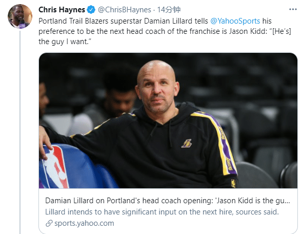 湖人队这边最终能不能得手,还要等到休赛期,可是另一个名记CHRIS的爆料或许会让湖人队球迷感到糟心,为什么这样说呢?6月5日,开拓者队宣布和主教练斯托茨分道扬镳,利拉德也在社交媒体上感谢了斯托茨的努力,开拓出也因此进入了主教练挑选的时刻,而利拉德也得到了参与其中的机会。