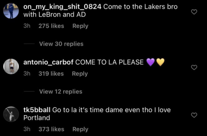 利拉德昨天被认为不满现状的动态是“我到底还要奉献多久 ?机会何时才会到来?”很多湖人球迷们纷纷在下面留言,甚至还有不少的湖人球迷跪求利拉德来到洛杉矶加盟湖人,全力冲击总冠军。
