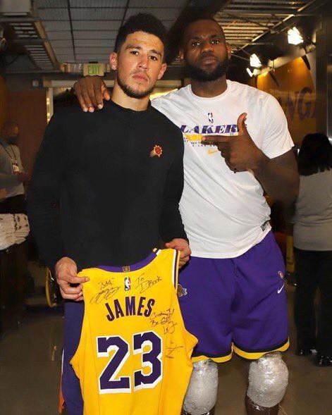 冲突不断,剑拔弩张,这是很多球迷对于这场比赛的定义,可是有趣的是赛后媒体爆出 的照片,比赛中还对着湖人队一顿猛喷的布克竟然跑到了湖人更衣室这边找詹姆斯要了签名球衣并且合影。