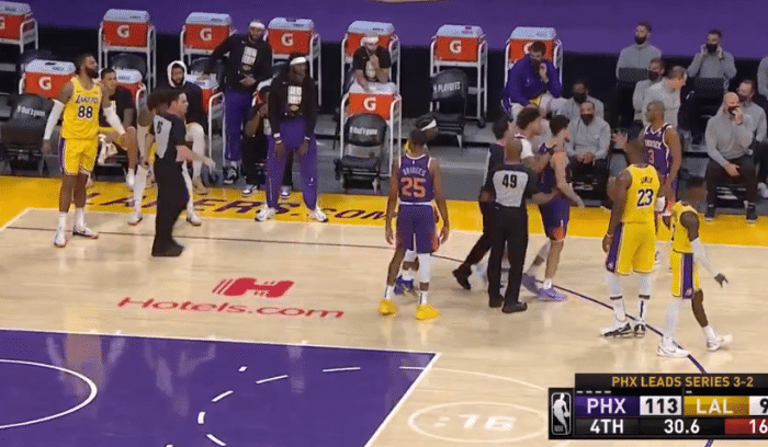 布克的暴扣也激怒了湖人队的球员,大莫里斯站了出来和布克发生了口角,显然大莫里斯他们认可了输球,可是并不认可布克这种羞辱对手的行为,双方的这个小冲突,因为太阳队球员克劳德的加入而升级,最终克劳德被罚下,大莫里斯也没能跑的了。这场比赛也在詹姆斯的湖人队提前认输,太阳队剑拔弩张的氛围下就这样的结束了,在比赛结束后,詹姆斯也没有了和对手互动的心思,他低着头回到了更衣室。