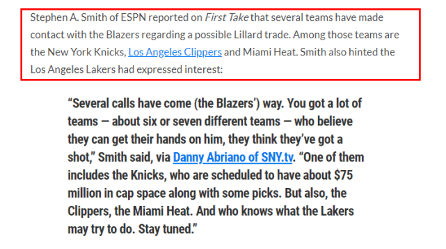 为什么是利拉德呢?再一次被淘汰后,利拉德在社交媒体上表示:我到底要再奉献多久?机会何时才会到来。这一段言论也被很多记者和球迷认为是利拉德的离队讯号,根据史密斯的爆料,已经有多支球队联系了开拓者,其中包括了快船和热火,而湖人队很有可能在夏天开始追求交易利拉德。