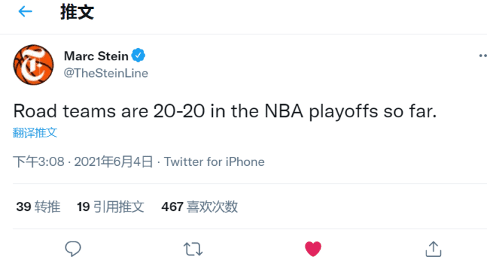 来源:24直播网06-04 17:0024直播网讯讯 随着球迷回归,主场优势还是显得非常重要的,但今年季后赛打到现在,出现了一个非常有趣的现象!据名记marc stein统计,截至北京时间6月4日,一共打了40场季后赛,而主队和客队都赢了20场,主场客场胜率刚刚五五开!