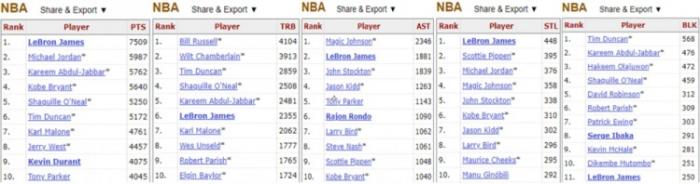 詹姆斯半场14分4板2助1抢断2封盖,投篮8中4,三分4中2。凭借着他的两次封盖他正式加冕历史第一人,而且是前无古人可能也后无来者的神迹,那就是季后赛5项主要数据均位列历史前十。目前季后赛生涯得分7532(历史第1),篮板2359(历史第6),助攻1890(历史第3),抢断450(历史第1),盖帽251(历史第10)。