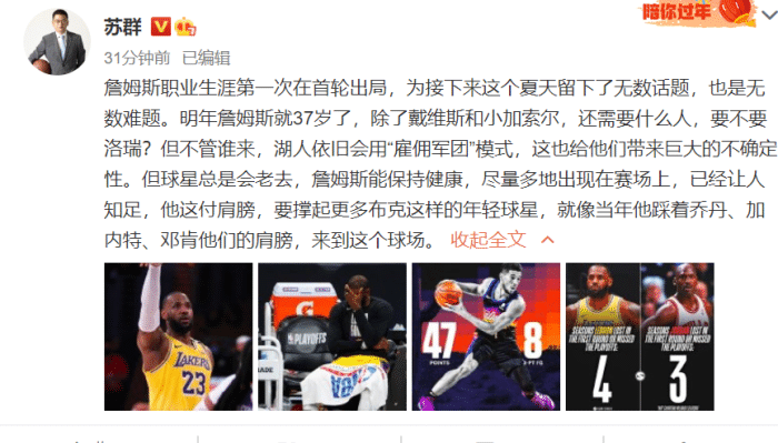 苏群则是在个人微博上提出了建议,他认为湖人仍会使用“雇佣军团”模式,也就是说签几个短期的角色球员来帮助球队夺冠,因为他们想在老詹之前既保证薪资灵活度还能保持争冠能力。在解说过程中他建议湖人去追洛瑞,因为相比施罗德他的三分球以及经验更出色,更适合打硬仗。